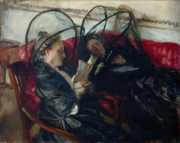 Curator: Let's turn our attention now to Claude Monet's "Meditation, Madame Monet Sitting on a Sofa," completed in 1871. Here we have a portrait of Camille Doncieux, the artist's wife. Editor: It's strikingly intimate, wouldn't you say? She looks... lost in thought, or perhaps a little melancholy? The red book she's holding provides this pop of defiant color amidst the otherwise subdued palette. Curator: Indeed. Observe the composition; the diagonal line formed by the sofa and her body leads the eye from the lower left to the upper right, creating a sense of depth. The dark dress, contrasted with the floral pattern of the sofa, creates visual interest through juxtaposition. Editor: That floral sofa screams "domestic tranquility," while her posture tells a different story. There’s this push and pull – like the waves in one of Monet’s seascapes. You almost feel like you’ve interrupted a very private moment. Does it evoke that feeling of being lonely in a crowded room, or is that just me? Curator: Her introspective gaze directs us away from any specific narrative. Monet uses visible brushstrokes to suggest rather than define. Consider the rendering of light and shadow – the face is partially obscured, emphasizing mood over detail. The structural relationships carry the piece. Editor: The heavy drapes in the background definitely create a mood – sort of heavy, like a weighted blanket. It is almost theatrical, isn't it? It feels like a stage where Camille is both actress and audience. Perhaps she's waiting for her cue? Curator: Precisely, we can understand it in terms of representation. What she signifies in relation to these elements of construction, Monet is creating something new from something familiar – domesticity with an emerging modern sensibility. Editor: Well, whether she is about to burst into tears, is about to jump for joy or go back to sleep, that red book provides a key. A very small, very vibrant clue. Curator: So very true. In conclusion, Monet delivers a study in contrasts, formally and emotionally. Editor: Absolutely! "Meditation, Madame Monet Sitting on a Sofa," a picture of waiting that sparks our imagination every time.