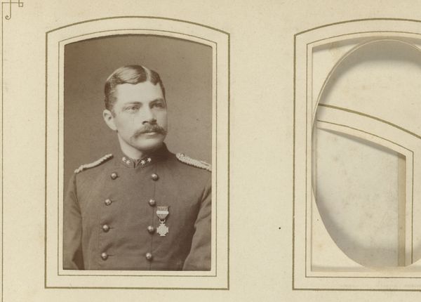 Albert Greiner made this albumen print titled "Portret van een man met snor in uniform" sometime in the 19th century. It captures a man in uniform, a symbol of authority and service during an era defined by nationalism and military expansion. This image invites us to consider the relationship between identity, representation, and power. The subject's uniform signifies a commitment to the state, yet his pose and expression suggest a more complex inner life. Greiner was Swiss, and his choice of subject may have been influenced by his experience of political tensions and military mobilization in Europe. Portraits like this one often served to reinforce social hierarchies and gender roles, portraying men as stoic defenders of the nation. However, by focusing on the individual, Greiner hints at the personal stories behind these official representations. It serves as a reminder of the human experiences intertwined with broader historical narratives.
