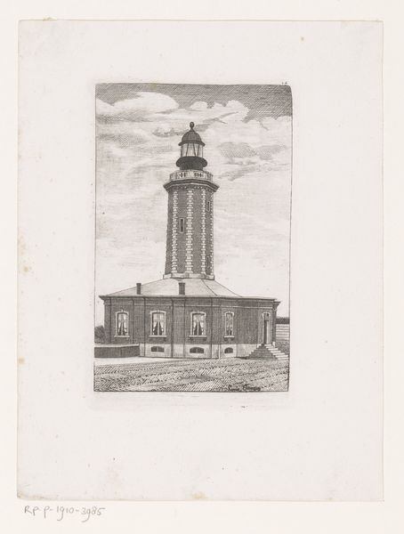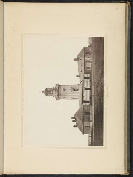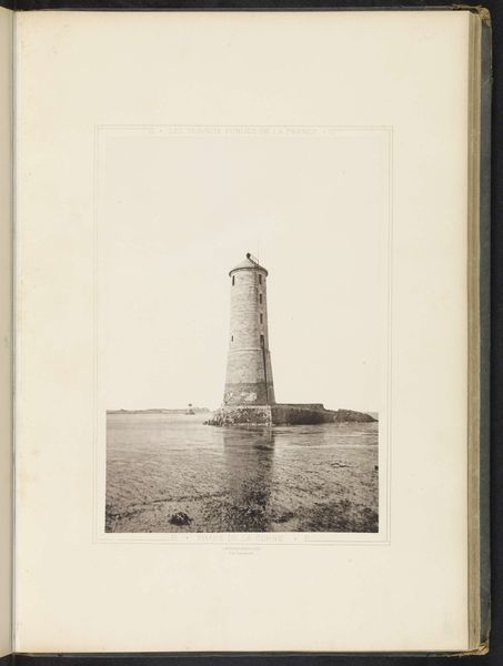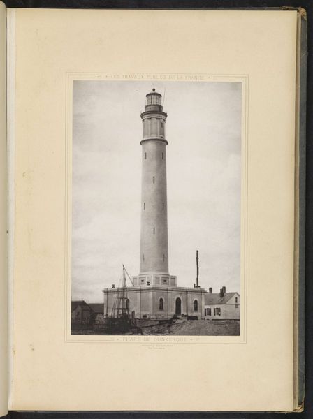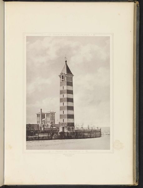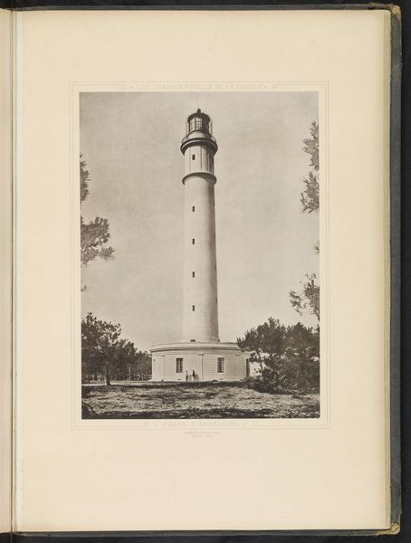 Editor: Here we have an albumen print, predating 1883, titled "Vuurtoren van Pointe de Grave". It's quite striking how the photographer emphasizes the verticality of the lighthouse against what looks like a gathering of people in the lower portion. What formal elements stand out to you? Curator: Note the masterful way in which the photographer has used light and shadow to articulate the architectural form of the lighthouse. Observe the stark contrast between the smooth, pale surfaces and the precisely rendered details of its construction—the rhythm of the small windows, the texture of the stone, and the cast shadows. This interplay creates depth and imbues the structure with a tangible presence. Editor: The precision is indeed compelling, particularly the framing by the trees and building to the left, versus the openness on the right, almost drawing you up the structure and back down. Curator: Precisely! How does the interplay of light and shadow, balanced with a variety of natural elements, influence your perception of the subject's inherent structural integrity? Consider the photographer's deliberate placement of the structure, which encourages contemplation of the interplay between natural forms and human constructs, inviting one to assess how these entities engage in a spatial context. Editor: It emphasizes that the construction blends with its environment. I had not considered how they blend structurally with light as a connecting property, even given such dissimilar textures. Thanks for showing me new avenues in studying it! Curator: Likewise, examining such an image brings out a fresh view on the relationships between architecture and the environment.