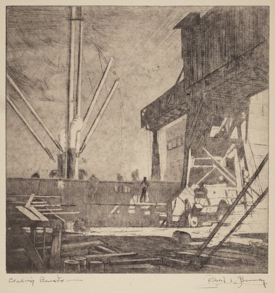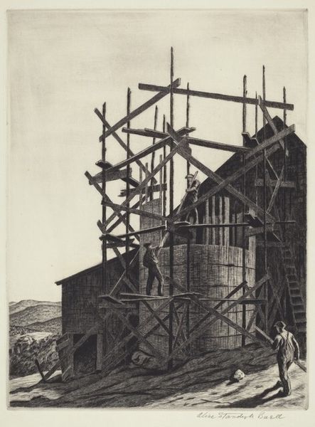 Jackson Lee Nesbitt's "Stripping Ingots" presents an industrial scene rendered through etching on a metal plate, transferred onto paper. The composition is a dense network of lines, forming shapes and textures that evoke the raw, imposing nature of factory work. The monochromatic palette emphasizes contrasts in light and shadow, creating a dramatic visual experience. Nesbitt's mastery lies in his ability to capture the structural complexity of the factory setting. Lines converge and diverge to define the metallic girders, stacks of ingots, and looming machinery, which can be seen as a semiotic system that reflects the industrial age's values. The artist challenges traditional notions of beauty, finding it instead within the geometric precision and functional design of the factory. Look at how the precise, calculated lines create a rigid structure with an underlying sense of industrial power. Nesbitt makes a statement about the evolving aesthetics of the 20th century, where beauty is redefined through the lens of industrial functionality and geometric precision.