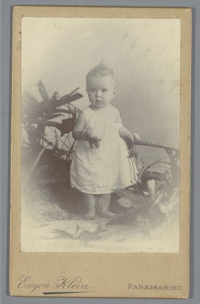 Curator: Wilhelm Frederick Antonius Delboy's "Portret van een zittende jongen met bloemen," dating from the late 19th century, is a striking gelatin-silver print. Editor: Oh, look at that! My first thought is, vulnerability. He looks like a tiny, somewhat apprehensive cherub who's wandered in from the garden. Curator: Precisely. Delboy’s composition, while seemingly simple, achieves a carefully calibrated effect. Note the central placement of the subject, framed within soft, diffused lighting. The textural contrast between the boy's delicate features and the roughly hewn chair is also quite masterful. Editor: It’s interesting—that rough chair makes it feel…earthy, almost like he's part of the landscape. His grip on those flowers seems protective, a child claiming ownership over something fragile and beautiful. Like he knows how fleeting beauty can be. Curator: The muted tones further enhance the overall sense of nostalgia. The absence of sharp lines compels us to fill in the emotional details ourselves. This is not just a portrait, it is, to borrow a term, an evocation. Editor: Absolutely! And there’s something kind of heart-rending about knowing this was captured a hundred years ago, or more. I start wondering about his life, the sort of world he entered after this fleeting moment. Did the flowers inspire his own art or imagination? Curator: Such associations, while imaginative, distract from the core artistic elements at play. Consider, rather, the photographic techniques and the intentional subversion of traditional portraiture to express deeper sentiments of feeling and emotion. Editor: Oh, I appreciate the technique. It’s beautiful and considered. But seeing it stirs up stories, ya know? I look at him, his chubby little hands holding that fragile little bouquet, and I can’t help but wonder. That’s art, I think. It’s a bridge. Curator: Perhaps. Still, a study of form reveals its power and artistry. Editor: Agreed. Looking again at Delboy's capture of an instant reminds us that the art resides not just in the composition, but what the composition reveals: both past and present.