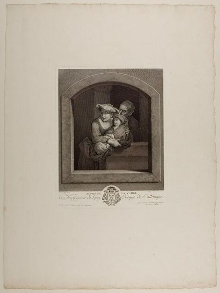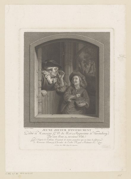 Curator: Johann Georg Wille's print, "Young Instrument Player," presents a vignette viewed as if through a window. Note the delicate rendering of light and shadow. Editor: It’s quite charming. The plate's stark lines give it a certain rustic feel, like a well-worn engraving passed between many hands. I am interested in the process by which this was made. Curator: Precisely! The composition divides neatly into foreground and background, with the figures framed by the arch. This creates a compelling sense of depth. Editor: And consider the labor involved in the printing process. The social position of Wille certainly affected the work's reception and distribution. Curator: Indeed, the print embodies visual refinement. The very lack of color heightens our attention to the details of form. Editor: I agree. The work prompts one to reflect on the historical context of its production. Curator: It’s a fascinating glimpse into another era. Editor: Absolutely. It makes me think about the historical methods of production.