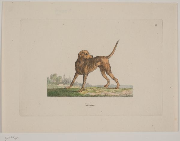 Curator: My initial impression is a study in quiet dignity; there's something noble about this canine portrait. Editor: Indeed. We’re looking at "Hector", an engraving by Christian David Gebauer dating back to 1821. It resides here at the SMK, the Statens Museum for Kunst. Curator: I find it intriguing that Gebauer chose a dog as his subject. Animal portraiture provides an interesting lens through which to examine shifting class dynamics and evolving attitudes toward pets in the 19th century. What purpose did prints of dogs serve then, beyond just decoration? Editor: Excellent question. At the time, there was a booming interest in various dog breeds, often associated with specific social classes. The portrayal of animals also aligned with Romantic ideals about nature. Hector could have been a noble's hunting dog. Prints like this circulated, shaping tastes and documenting such trends for a broader public. Curator: So, in a sense, this seemingly straightforward engraving could offer a commentary on power and status as ascribed not just through human, but canine representation? The whiteness of the belly compared with the depth of color on the rest of his body creates a unique division. Editor: Absolutely. Notice how Gebauer rendered Hector against a simple, natural backdrop, positioning the dog slightly above the landscape. This subtle elevation contributes to that feeling of inherent superiority and controlled grace. What do you make of the print's artistic elements, beyond its subject matter? Curator: I'm drawn to the almost hyper-realistic depiction – a style rooted in a specific historical moment in portraiture and shifting tastes. I do find it difficult to look past contemporary theory, and therefore, examine how ideas around control and ownership come into play here, influencing both representation and reality. Editor: That’s a useful perspective. Perhaps a tension between the dog's apparent freedom, conveyed through his active stance, and its implied social role. Works such as "Hector" give insights into how artistic tastes were politically informed. Curator: Thank you. It allows for rich conversation around intersections of class, human, and non-human narratives of power. Editor: Agreed. This piece reminds us that the study of even seemingly simple imagery can unlock multifaceted social dialogues.