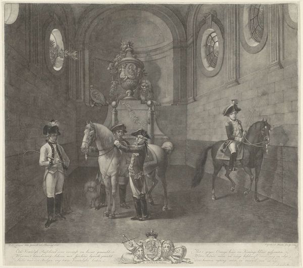 This print, "Guardroom with Reading, Smoking and Card Playing Officers" was made by Jan Punt in the 18th century using engraving techniques. Notice how the fine lines of the engraving define the textures and details within the guardroom, from the plumes in the officers' hats to the patterns on the walls. The process involves meticulously incising lines onto a metal plate, which is then inked and pressed onto paper, resulting in the detailed, monochromatic image we see here. But the choice of engraving, a method closely tied to reproduction, also connects this artwork to a broader social context. By using printmaking, Punt made this image accessible, transforming the officers’ private leisure into a commodity. This allows us to consider the social status of these officers, their consumption habits, and the labor required to produce the print itself. The act of making and distributing the image transforms their behaviors into objects of public consumption. The material and process are thus integral to understanding the print’s full meaning, pointing us to the relationship between art, commerce, and social class in the 1700s.