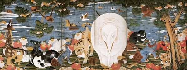 Curator: Look closely at this section of the fresco cycle "Allegory of March – Triumph of Minerva and Sign of Aries," a portion of the extensive wall paintings completed around 1470 by Francesco del Cossa in the Palazzo Schifanoia. What's your initial response? Editor: Two elegant swans glide across the surface of a river; the water, painted with the thinnest of brushstrokes, evokes a feeling of serene lightness, which is slightly contradicted by the strangely formal positioning of the swans, are they wearing red life preservers? Curator: Note that red bands around their necks. Swans often appear in mythology to symbolize love, purity, and grace; the addition of what may very well be life preservers could serve a cautionary purpose in an allegorical way, perhaps the artist aimed to subvert traditional notions, hinting at fragility even amidst beauty? Editor: Indeed, and I’m intrigued by del Cossa’s use of fresco—a medium that demands meticulous planning and confident execution. The lines, although delicate, present themselves with an air of utmost assuredness, particularly in the swans' intricately delineated feathers. The medium's texture gives an authentic tactile quality and creates some truly wonderful chromatic vibrations! Curator: Considering that the whole painting connects March with zodiac and classical themes, the swans draw upon cultural associations: Minerva, goddess of wisdom and strategic warfare, her domain including craft and strategic thinking, this piece of symbolism gives this artwork extra layers of complexity. These birds speak beyond aesthetics to a tradition of storytelling. Editor: The rendering is precise, crisp. I'm impressed with how effectively the medium evokes this delicate interplay of shadow and highlight to shape volume! Even if the image's full contextual and cultural density remains outside our reach today, del Cossa clearly left an interesting artifact open for conversation. Curator: Absolutely. These allegories allow a peak into how the world's viewed at the time, inviting discourse on historical perspective, societal symbolism, and creative expressions that continue transcending time! Editor: A splendid conversation to have indeed, even today it invites us to examine and reimagine classic artistic expression from a very original approach.