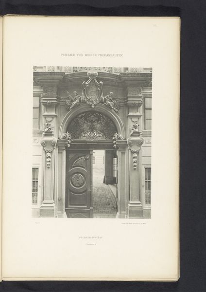 Curator: This image is a print of a photograph, dating from before 1894. It's titled "Toegangsportaal van Palais Trautson te Wenen," depicting the entrance portal of the Palais Trautson in Vienna. Editor: My immediate impression is one of guarded grandeur. The imposing facade and statuary contrast starkly with the lone figure standing in the entryway; the scale seems intentionally alienating, indicative of institutional power. Curator: Indeed. Note the meticulously crafted columns and the elaborate relief carvings above the doorway. The Palais Trautson served many purposes throughout history, including housing the Austro-Hungarian Noble Guard. Analyzing its construction offers a lens into the craftsmanship and economic structures of the late 19th century; where the materials were sourced and what sort of laborers built it, tells the tale of the time. Editor: Right, and beyond material origins, we can also explore the image itself. It's fascinating how the photograph situates an individual within the overwhelming structure, potentially highlighting class dynamics. A critical question to ask here: what narrative does the composition construct about the people permitted and, more importantly, not permitted to pass through such portals? The figure almost appears as a gatekeeper. Curator: I am particularly interested in the printmaking process itself. Understanding how this photograph was reproduced allows us to see the transformation of a visual document through the technologies of mass production, bringing questions of ownership and reproducibility to the forefront. Editor: Yes, it leads one to consider its distribution at that time, too. Beyond architecture and craftsmanship, these types of images were used as documentation and forms of representation, reflecting cultural attitudes and systems of power, where images and prints such as these reinforced the existing societal hierarchies. Curator: Studying this image has given me renewed appreciation for the intricate network of artisans, the printers and the manufacturers, all collaborating behind the scenes to facilitate the cultural dissemination of an image. Editor: Reflecting on the symbolism, composition, and material and political contexts really amplifies the emotional impact of that singular figure beneath the towering portal—I'm grateful for this reminder to interrogate the structures around us.
