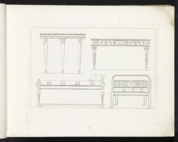 Pietro Ruga sketched these ornamental borders, tables, and a cabinet, capturing a timeless pursuit of beauty through form and detail. The floral motifs running along the borders, reminiscent of ancient Greek friezes, speak to a deeper connection between nature and civilization. These circular flowers, echoed across centuries and cultures, emerge in Renaissance tapestries, and even in the Art Nouveau movement as a symbol of rebirth and continuity. Notice the stylized acanthus leaves, a motif seen in Roman architecture, which here provide a sense of classical elegance. These motifs, charged with historical and cultural meanings, possess an almost psychic power. Why do these specific symbols, replicated through time, stir a sense of familiarity within us? Perhaps it's the collective subconscious, where symbols linger, continuously shaping our aesthetic sensibilities. They appear, disappear, and reappear, transformed yet still recognizable, a testament to the cyclical nature of cultural memory.