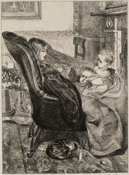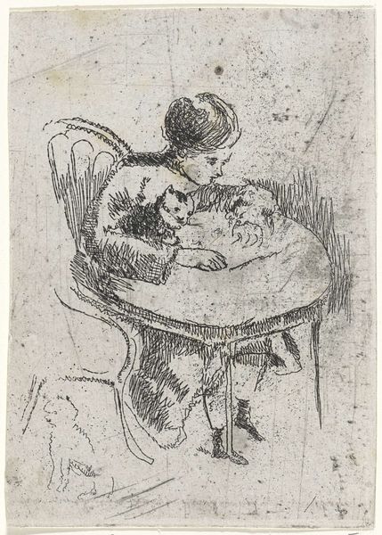 François Bonvin created "Le Dessert," an etching, using a network of finely articulated lines that draw us into the quietude of the scene. The composition is organized around the stark contrast between the dark background and the illuminated figure. Bonvin masterfully uses chiaroscuro to direct our attention to the child seated in the chair. Her features and clothing are rendered with detailed precision. This contrasts sharply with the surrounding shadows. We can read the artist’s intention to highlight the child's introspective moment within the domestic space. The chair, almost throne-like, elevates the child. The etching technique allows Bonvin to explore textures, from the smoothness of the child's skin to the rough grain of the wooden chair. Ultimately, Bonvin uses the formal elements of light and shadow to create a scene which invites reflection on the everyday moments that shape our perceptions.