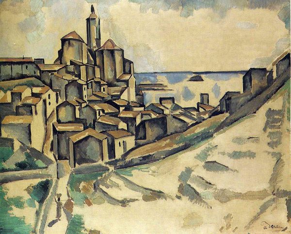 Curator: Welcome. Before us hangs an early painting by Joan Miró, created in 1918. Though titled simply “Untitled”, it offers a vibrant look at the artistic development of this soon-to-be Surrealist icon. Editor: I’m immediately struck by the heavy, almost turbulent atmosphere. The sky looks quite menacing, overshadowing the architecture below. Curator: It's interesting you say that. I see Miró grappling here with Expressionism and perhaps even Fauvist color palettes. These art movements were becoming prominent at the time and offered artists like Miró avenues for self-expression, as society became increasingly disconnected following WWI. He uses bold colors and somewhat distorted forms to convey emotion. Editor: Precisely! It’s as if the city itself is in turmoil, reflecting the societal anxieties brewing at the end of the war. The shadows that fill every archway have this unsettling presence. We see these boats sitting in the lower foreground… Do they symbolize stalled journeys or maybe opportunities, and who is prevented from either taking advantage or setting sail? Curator: A fitting interpretation. I imagine Miró may have been channeling feelings that were widespread within the culture. The positioning of that central church creates an important point in this composition. It reminds us of traditional institutions and the people still clinging to hope amid global turbulence. It asks the question "where can we go to for help and is that institution also complicit in our current climate?" Editor: So, it's an ambiguous hope, perhaps? An element both anchoring the scene and, in its rigidity, highlighting the era's restrictive norms. That is definitely a topic to unpack, which extends to questions about class, race, and who does that help reach. Overall, it makes me question how we look to those central power structures, what part they play, and what change needs to happen there to better benefit marginalized identities and communities. Curator: Miró evolved drastically beyond this Expressionist phase. However, this early work presents an intriguing perspective on a world on the cusp of profound changes. It's also important that visitors recognize what society was going through in the era this was created and not diminish those realities and struggles. Editor: A powerful visual echo of its time, indeed. Its relevance transcends art history, touching upon enduring social and political dialogues that persist even now.