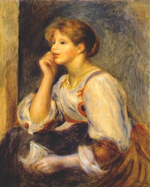 Curator: Looking at Renoir’s "Portrait of an Anonymous Sitter" from 1875, I’m struck by the quiet introspection. What do you make of it? Editor: The rapid brushwork gives the composition a spontaneous feel, but I get the impression that we're seeing more than just the sitter’s momentary expression. I sense an undercurrent of constraint, maybe even melancholy. Curator: That's fascinating. Notice the texture, built up with layers of oil paint, yet, instead of sharp delineations, forms appear through subtle gradations. I’m particularly interested in how Renoir models the face and drapes her body, constructing soft tonal contours with paint. Editor: Renoir’s Impressionist technique clashes intriguingly with the academic conventions of portraiture at the time. Commissioned portraits served a distinct purpose for wealthy patrons, and his choices here reveal much about changing societal views towards portraying women in art. The sitter looks like she holds status within bourgeois circles. Her attire exudes a sophisticated sense of prestige; nevertheless, her identity remains a secret, obscured behind the layers of artistic interpretation. Curator: Exactly. Look at the colour harmonies, the muted blues and browns contrasted with the delicate whites of her lace collar. This gives the image a specific compositional arrangement to examine carefully, while also contributing to the picture’s melancholic air that we’ve discussed. The interplay is less about representation and more about capturing light and mood, and is crucial to decoding Renoir’s artistic intent. Editor: Absolutely. As we think about that artistic intent, let’s remember that Impressionism wasn't simply about aesthetics; it was a rebellion against the rigid norms of the art establishment. Renoir was showing this woman, or perhaps more accurately an artistic impression of this woman, according to new values within society. This portrait tells us volumes about the evolution of power, status, and artistry itself. Curator: Yes, this anonymous sitter, immortalized in fleeting brushstrokes, becomes more than a person. The work, a combination of representation and visual design, presents an opportunity to reconsider our perspective of artistic representation within portraiture. Editor: And a society undergoing immense transformation. It makes you wonder, who was this woman and what did this artwork mean to her within a changing historical period?