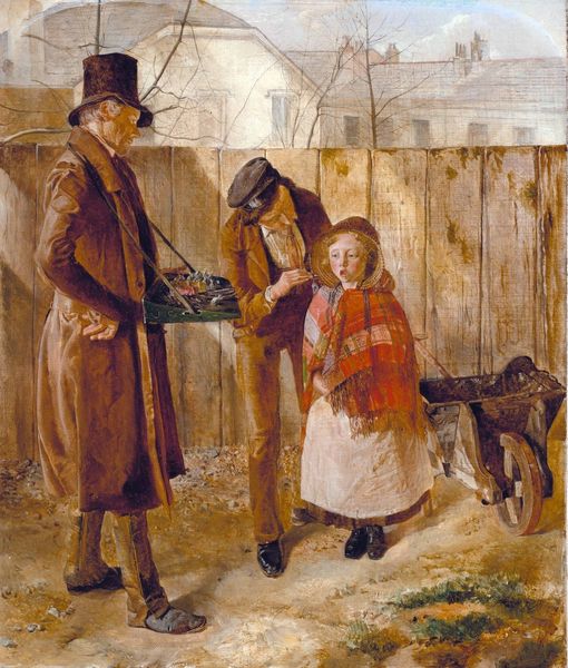 Franz von Defregger painted "Der kranke Dackel" using oil on canvas. The textured brushstrokes build up the scene, giving the painting a tangible, almost sculptural quality. Soft earth tones and muted greens prevail, establishing a somber, empathetic mood. The composition is carefully arranged. A diagonal line leads our eye from the lower left, up the small boy and to the right, towards the figure pulling the door's bell. This directs our focus to the heart of the narrative: the children's concern for their unwell dachshund. The painting engages with sentimental themes common in 19th-century genre painting, but it also operates as a semiotic system. The children's traditional clothing signals a specific cultural context, while the architectural elements suggest a rural setting. The ailing dog, carefully placed in a makeshift bed, becomes a powerful symbol of vulnerability. Ultimately, "Der kranke Dackel" invites us to consider how visual elements work together to communicate both personal and cultural narratives, creating layers of meaning through a seemingly simple scene.