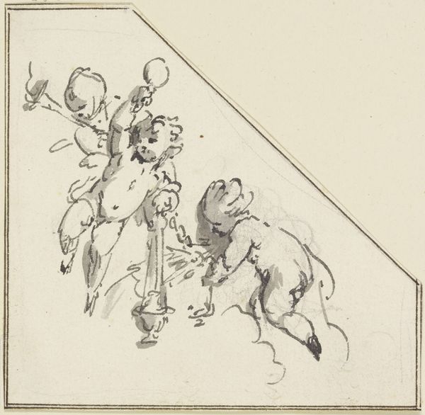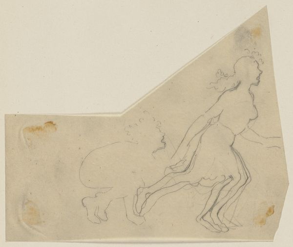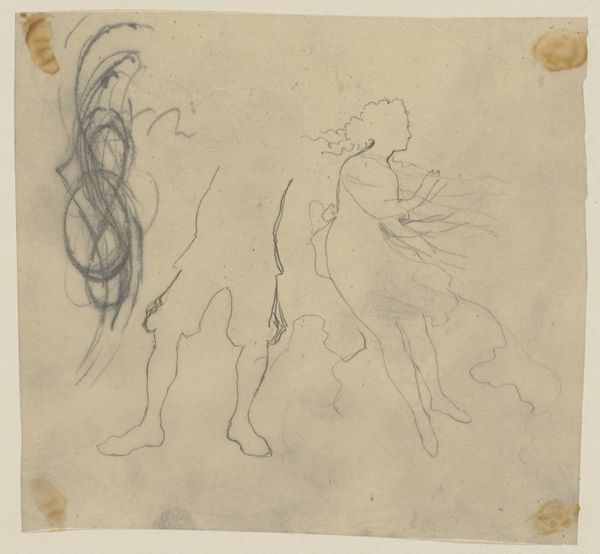 Curator: Looking at this preliminary sketch by Paul Konewka, dating to around 1867-68, currently held in the Städel Museum, I’m immediately struck by its dynamic quality. It seems so alive, so charged. What do you see first? Editor: The linearity, undeniably. These figures sketched in pencil against the off-white of the paper. They convey a powerful sense of movement, the energy almost escapes the page. Curator: Indeed. This is Konewka’s interpretation of a scene from Shakespeare’s “A Midsummer Night’s Dream.” We have the lion and Francis Flute as Thisbe, and even without vibrant colors, Konewka’s drawing carries so much of the play’s humor. Editor: Humor, absolutely. But it's cleverly concealed. We’re accustomed to grand narratives in Romanticism, yet Konewka teases at theatricality in simple strokes. The lion's posture – is it pride or comical menace? And Thisbe—is he recoiling from terror or camp exaggeration? Curator: It's in the symbols too, the very forms he presents. Notice how he positions the characters to subtly communicate a relationship between danger and vulnerability—the lion and the actor in disguise. Even a slight shift in our viewing angle and our perception of their interactions may completely change. Editor: Precisely! And there's a fascinating incompleteness. The sketchy lines, almost tentative, invite our imagination to participate, to flesh out the story ourselves. He challenges conventions, inviting you to engage deeply, philosophically, with artmaking itself. Curator: Konewka uses those rough lines to hint at an underlying connection between two characters with divergent purposes in their respective plots, an attempt to explore those fleeting moments of understanding that exists among diverse personalities, I suspect. This is, again, so characteristic of his attempt to translate those larger-than-life emotions on to the figures in question. Editor: That tension between the unfinished and the deeply symbolic is, for me, where its power lies. What a striking study in character relationships and, dare I say, proto-cinematic storytelling via line work! Curator: It leaves us contemplating not just a story, but also the layers of emotion woven into Konewka’s translation of the material.