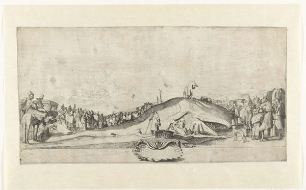 Editor: This is "Cattle Market in Leyden" by Max Liebermann, an etching. The stark lines and focus on the working class make me wonder about the artist's intentions. What stands out to you? Curator: It's intriguing to consider Liebermann's process. Etchings allowed for multiples, making art more accessible. How does this mass production change the reception and perceived value of the imagery of the cattle market? Editor: That’s a great point! I hadn't considered how the medium itself reflects on the subject matter and how it democratizes art. Curator: Indeed, it invites us to think about artmaking as a form of labor, mirroring the work depicted.