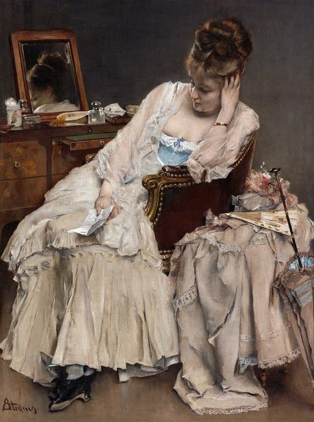 Alfred Stevens painted "Women's Harp" in France, but the exact date is unknown. It offers a glimpse into the cultural values of the upper class during the 19th century. The setting oozes luxury and elegance. The woman, likely a member of the bourgeoisie, stands poised with her harp and sheet music, symbols of leisure and refinement. Music was considered a valuable skill, especially for women of this social standing, as it added to their marriageability. Note the sumptuous fabrics of her dress, the ornate details of the harp, and the carefully arranged bouquet on the sofa. These details highlight the importance of appearances and cultivated taste in this era. The art world of 19th-century France was regulated by the Academy des Beaux-Arts and the Salon system. Stevens, though aligned with academic tradition, also embraced elements of realism. To understand the painting better, explore the archives of French fashion magazines or the musical scores popular at that time. The meaning of art lies in these social and institutional contexts.