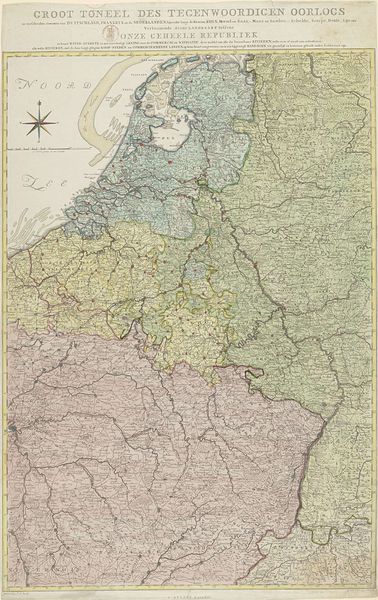 Curator: Here we have "Kaart van de Nederlanden omstreeks de tiende eeuw," or "Map of the Netherlands around the tenth century," an engraving created between 1855 and 1857 by P.J. Fassbender. Editor: It looks like a memory, fading and pieced together from fragmented recollections. The detail is incredible, though, evoking a sense of scholarly dedication. Curator: Absolutely. Fassbender’s map is more than just geography; it is a statement about the constructed nature of national identity, relying on a romanticized view of the past to inform the present. Notice how the regions are delineated not just by borders but by textual annotations. This calls attention to how the narrative and linguistic define geographic spaces. Editor: The prominence of rivers and waterways stands out. They're drawn with such care, almost reverence. Water is life, of course, but in cartography, it often represents connection and passage—trade, cultural exchange, and even invasion. Curator: Indeed. And the scale is interesting, too. By focusing on this specific historical period, the map invites a comparative analysis with the contemporary Netherlands. Questions about shifting borders, cultural exchanges, and the legacy of power dynamics come into play. Who benefits from a particular rendering of history? That is what this piece brings up for me. Editor: Thinking about tenth-century Netherlands, one can't help but imagine the cultural soup of influences, the early formations of language, customs, and social structures represented through the iconography of its layout. This rendering allows me to look at my relationship to Dutch history through symbolic eyes, to find cultural memory. Curator: It also makes me consider how this 19th-century map, created using techniques of engraving and etching, presents a view of the past that reflects the concerns and biases of its own time. This tension makes the map very alive as a document. Editor: Precisely. This blending of artistry, history, and symbolic geography certainly provides fertile ground for reflection. It urges us to consider the Netherlands not only as a place but as a cultural, symbolic idea in flux.