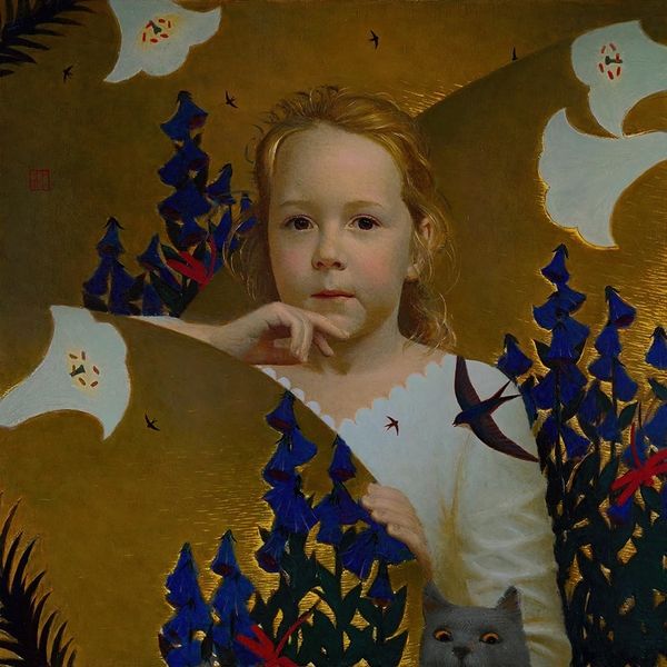 Curator: Here we have Andrey Remnev's "Silk Road," completed in 2013. Notice the use of oil paint and gouache. What's your immediate response to it? Editor: Dreamlike, utterly dreamlike. That gold leaf... it makes the scene feel both intimate and boundless, like peering into someone's childhood fantasy. Curator: The painting indeed occupies an interesting liminal space. We observe a young boy, presented in a realistic manner, contrasted against this heavily stylized, almost decorative background, pulling from traditions we often see in Orientalist painting. Editor: Right? Those vibrant koi fish swirling around him – they're both beautiful and a bit unsettling. They seem less like living creatures and more like symbols, clinging to him, as though forming some strange armor or a visual poem he's carrying. And those curious birds. I'm really drawn to that one tiny bird looking at us. Curator: A fascinating interpretation. Focusing on the formal elements, the artist masterfully balances realism with flattened perspective. Note the limited palette, dominated by blues, golds, and reds, contributing to a sense of harmony and symbolic richness, particularly concerning the Silk Road concept. Editor: What resonates for me is that inherent stillness. Everything about that composition wants to explode with narrative. The boy is caught between boyhood and something monumental like, the Silk Road! The fishes seem like this vibrant, almost frantic energy of an adult, the burden... Yet it remains fixed. All of it somehow trapped on this one plane in this brief moment, Curator: A compelling reading. Perhaps Remnev sought to capture the moment of burgeoning consciousness, the crossroads of a life poised for journey and discovery. The boy's gaze meets ours, seemingly questioning what is to come. Editor: Perhaps. And that gold leaf, glimmering, suggests those limitless possibilities—like stars in the night sky or perhaps some shimmering treasure, that the young soul could be travelling towards? It is the perfect reminder of possibilities in the dreams we create for ourselves and others, and like every silk road journey it makes me question whether the dreams is a destination or maybe just the path itself. Curator: Yes. It encourages us to contemplate the artist's skill in layering meaning. The decorative merges with portraiture creating a rich tapestry for introspection. Editor: Beautifully put. This work is not just something to look at—it’s something to get lost within. It seems like the more you look the deeper into its mysteries you go!