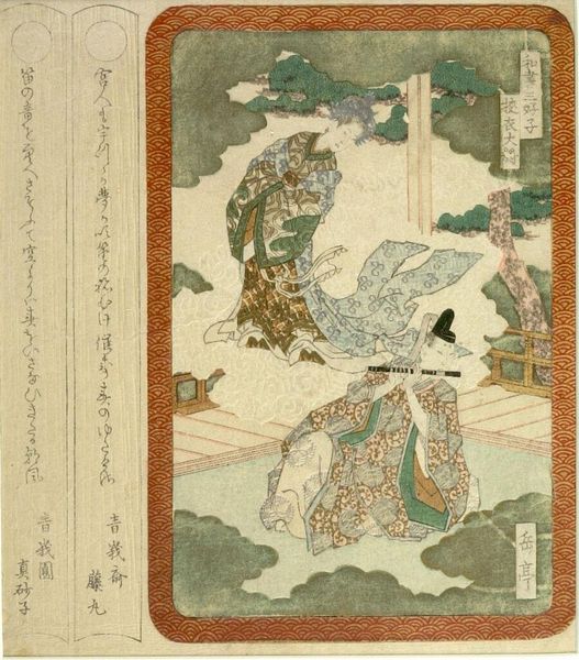 Editor: This is "The Syllable Ra, Tsukudo, from the series Courtesans for Compass Points in Edo" by Keisai Eisen. I’m really drawn to the intricate patterns on her kimono, but I'm not sure what to make of the scene in the upper right. How do you interpret this work? Curator: The frame around that scene suggests a symbolic window. Note how the torii gate, a sacred marker, leads the eye into the distance. It's a portal to a specific shrine, Akagi, and by extension, to the cultural and spiritual geography of Edo. Editor: So, it's more than just a pretty backdrop? Curator: Precisely. The series ties the courtesans to specific locations, imbuing them with associations of place and cultural memory. The "Ra" syllable itself could carry symbolic weight. What feelings does it evoke for you? Editor: I see, it’s like each courtesan embodies a compass point. Thanks, I’ll keep that in mind.