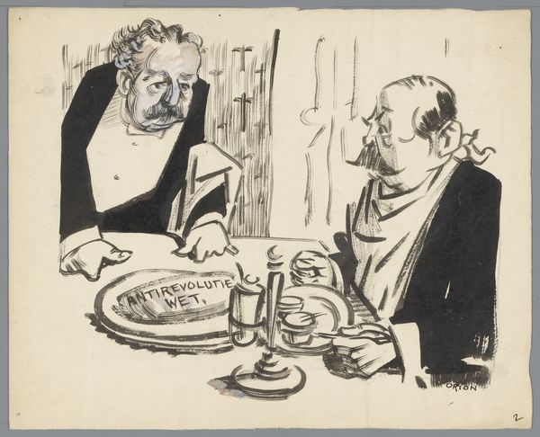 This drawing, *Colijn en de Tariefwet*, was made by Patricq Kroon in the early 20th century using pen and ink on paper. These are fairly quotidian materials, elevated by Kroon's skill. The lines vary in thickness and density, creating a sense of depth, texture, and movement. The image depicts a group of men gathered around a table, poised to consume the unfortunate Colijn, served in a Tariff bowl. The pen and ink medium allows for detailed and precise rendering. Each stroke contributes to the overall composition, building up the forms and adding tonal variation through hatching and cross-hatching. The spontaneity of the drawing style gives the image a sense of immediacy, as if captured in a fleeting moment. This approach to making art democratizes creativity, suggesting that powerful statements can be made with accessible materials. The artwork is a potent commentary on labor, power, and the ways in which political figures are consumed by the policies they enact. It reminds us that even the simplest materials can be used to create profound and lasting statements.