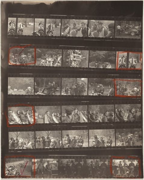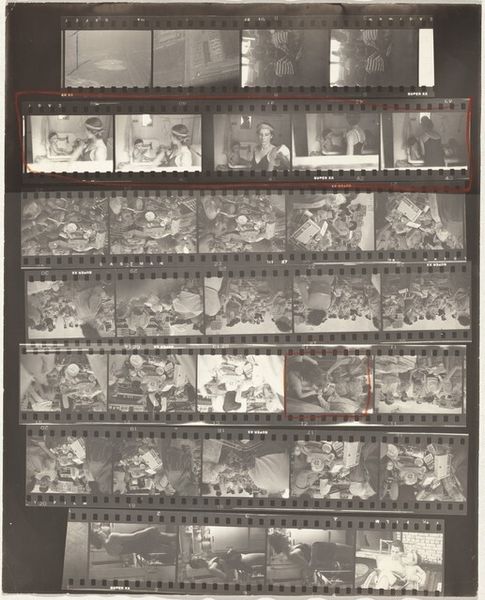 Editor: We’re looking at "Harry Truman, Robert, Ethel, Eunice and Pat Kennedy--Convention 12", a 1956 photograph by Robert Frank, done as a print. The immediate impression I get is one of almost frantic energy, maybe even a chaotic clamor. What draws your eye in this contact sheet, Professor? Curator: Chaos, yes, I love that description! For me, this image breathes that exhilarating, exhausting energy of political conventions. It's more than just a record; it’s a feeling. Notice how Frank chooses to show us the entire contact sheet, including the frame numbers. It invites us into his artistic process. What does that feel like to you, peering into the artist’s mind? Editor: It feels voyeuristic, almost, like rummaging through a personal archive. I notice how Frank is almost "testing" possible crops, like "this bit of film there, then here"... Curator: Exactly. We are witness to the genesis of the final image... but also being led astray down photographic possibilities never taken... like alternative existences. There's such immediacy in the grainy texture and the high contrast. Do you get the sense that he's trying to capture a specific emotion? Editor: I definitely see it in the faces - there’s a palpable tension, but also a sense of hope, maybe even manufactured enthusiasm! The stark contrast definitely adds to that feeling. Curator: Right? The drama inherent to it. Political conventions are staged affairs, and Frank's eye captured both the constructed narrative and the raw human reactions within it. Do you see that tension? The way it creates meaning in and of itself? Editor: Definitely. It’s like a behind-the-scenes look at the performance of politics. I never thought a simple photograph could feel so revealing and, at the same time, so artistically expressive. Curator: Frank wasn’t just documenting; he was interpreting. These pictures capture fleeting instants of the great human tragicomedy we find ourselves performing on the world stage, now and always.