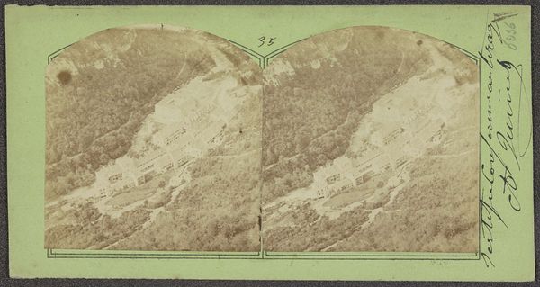 This stereoscopic photograph, titled "Berglandschap; de Alpen" (Mountain Landscape; the Alps), was created by Achille Quinet. It is an albumen print mounted on card. Consider the material of albumen, derived from egg whites, used to bind the photographic chemicals to the paper. This was a labor-intensive process, reflecting the burgeoning industry of photography in the 19th century. Quinet's choice of the stereoscopic format offers an immersive, almost tactile experience of the Alps, a landscape increasingly accessible through developing transportation networks. The twin images, when viewed through a stereoscope, coalesce into a single, three-dimensional scene. This technological approach speaks to photography's role in shaping perceptions of nature, turning it into a commodity for consumption. The very act of capturing and presenting the landscape embodies a shift in our relationship to the natural world, framing it as an object of both aesthetic appreciation and commercial interest. So, beyond the vista, this image holds a reflection on the social and economic forces at play in its creation and consumption.
