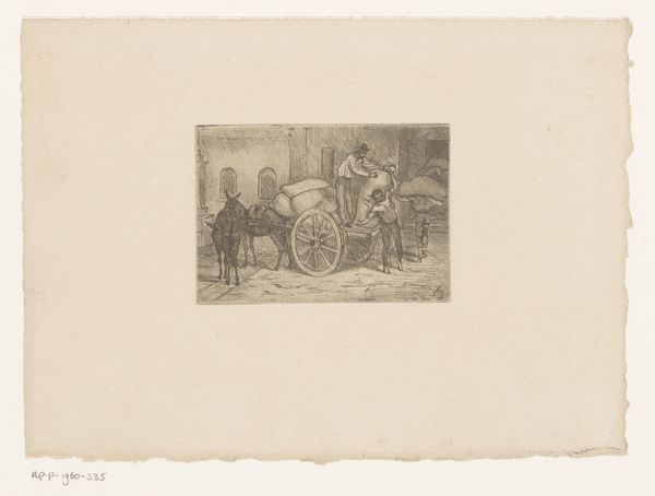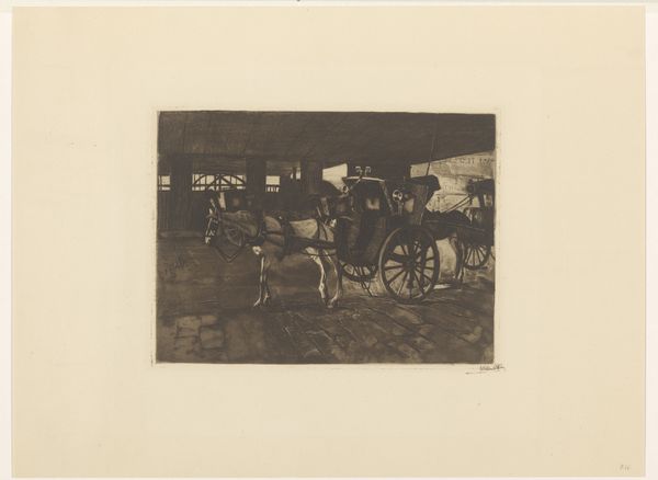 Léopold Flameng made this artwork, "Three Travellers on Horseback at a Resting Place", using etching techniques. The interplay of light and shadow creates depth and form within the monochromatic scheme, guiding our eyes through the scene. We are drawn to the travellers, their horses, and the architecture of the resting place. Notice how Flameng uses light and dark to differentiate textures. The building’s rough, aged appearance contrasts with the smoother surfaces of the horses and riders' attire. The structure of this etching offers a semiotic reading. The image’s setting becomes a signifier of respite, signaling a narrative beyond what is immediately visible. The scene invites us to consider the broader cultural context of travel and leisure. The artist's manipulation of light, shadow and texture is an aesthetic experience and offers insight into the era's values. It underscores the enduring importance of exploring art through close examination.