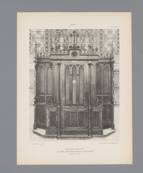 Curator: Looking at "Koorbanken in de Martinikerk te Bolsward," taken in 1879 by the Gebroeders Cordes, what’s your immediate reaction? Editor: My eye is immediately drawn to the intricate woodworking and overall somber mood conveyed through the sepia tones; there's an almost meditative quality to the piece. Curator: Yes, the visual weight of the repeating gothic arches certainly contributes. Note how the photographer uses a relatively shallow depth of field to subtly flatten the space, directing our gaze deliberately across the textured surface of the choir stalls. Editor: Precisely, and contextually, photographs of this kind often served as documentation of important cultural heritage sites. This image reveals much about the church's status as a community centerpiece and the historical importance of religious institutions. Curator: Indeed, though consider how the geometric precision achieved within the print, highlighting the relationship between vertical and horizontal planes. It offers a very structured understanding, somewhat removed from the daily lived experience within that religious institution. The print's very formal aesthetic serves as its meaning here. Editor: But wasn’t the burgeoning realist movement interested in portraying unidealized images of daily life? Wouldn’t capturing something like the choir stalls of the Martinikerk fall right into that interest, providing people with insight into how places of importance looked at that time? Curator: One could argue that the subdued lighting and carefully arranged composition almost romanticize this interior, softening realism’s potentially stark edge. But it offers an aesthetic encounter first and foremost, where we reflect upon the relationships between line, tone and texture and their symbolic potential to speak to grander spiritual architectures. Editor: So, rather than seeing it as a snapshot of reality, we can appreciate how cultural objects and realist sensibilities were framed in late 19th century photography, highlighting its function within a visual and social landscape. Curator: Precisely! An insight, perhaps, that moves us closer to an enriched comprehension of this compelling image. Editor: It highlights the many layers of looking at a photograph that seems so simple.