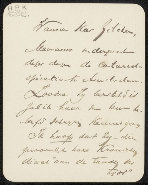Curator: We're looking at "Brief aan Philip Zilcken," or "Letter to Philip Zilcken," a drawing made with ink on paper by Henriëtte de Vries, likely between 1896 and 1898. Editor: It’s interesting to consider a piece like this in an audio guide. My first thought is how immediate it feels—there's something about handwriting that really collapses the distance between us and the past. Curator: Absolutely. The letter gives us insight into the networks of artists and writers at the time. Philip Zilcken was, of course, an artist and critic. Editor: A powerful gatekeeper in the art world. So, this letter, though seemingly personal, operates within a professional sphere. The script is incredibly precise and almost performative, yet very inviting. It would be revealing to uncover some more. Curator: De Vries mentions sending drawings to accompany a story titled "'t Heikhuis" which she hopes will be placed in the Elsevier’s Maandschrift. Elsevier was, and is, a prestigious Dutch publisher. The piece illuminates the collaborative nature of artistic production and the significance of magazines in disseminating art and literature. Editor: You can't escape the politics inherent in what gets published and what doesn’t. The power dynamic between De Vries, a woman artist, and Zilcken is palpable—knowing how much a positive reception from a figure like Zilcken might have impacted her trajectory is something we can imagine. The labor involved in producing the illustrations is very physical in the presentation of the text and ink; It makes one aware of all the work and resources of this piece as evidence of creative practices in its specific cultural moment. Curator: Her style is evocative of the Symbolist aesthetic, reflecting a move towards introspection and subjective experience which speaks of a broader movement of pushing boundaries for women at this time, but of course with so much more road still needed in the 1890s and still needing movement and adjustment today. Editor: I agree. It is valuable when thinking about the construction of meaning and considering the nuances of human connection and labor beyond canonical narratives in Dutch art history, especially with the rise of different kinds of movements and gender relations still needing reform today. Curator: Seeing such private communications reframes what we might call major and minor art historical objects or works, reminding us of all the invisible threads linking people and things. Editor: Yes, something simple as the history of correspondence unveils power structures that influence both artistic expression and artistic careers, thus offering tools and a map to challenge it.