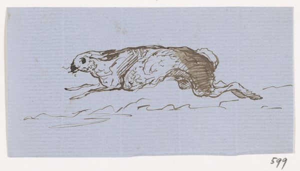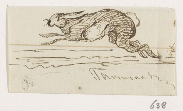 Johannes Tavenraat created this drawing, "Two Deer," with pen in brown ink on paper. The composition immediately conveys a sense of dynamic movement. The deer are captured mid-leap, their forms elongated and emphasized by the artist's use of swift, confident lines. Tavenraat masterfully uses line weight and density to define the animals' musculature and create a sense of depth, even within this minimalist rendering. Consider the form of the deer themselves. Their bodies are not depicted with anatomical precision but rather with a focus on capturing their essence of motion. The semiotic play here lies in how Tavenraat employs the cultural symbol of the deer—often associated with grace and freedom—and amplifies these qualities through his expressive linework. This piece destabilizes the traditional static representation of animals, offering instead a fluid, almost ephemeral image. The rough, unrefined quality of the line underscores a sense of immediacy. It reminds us that art is always a process of interpretation, a fleeting moment captured and made permanent through form.