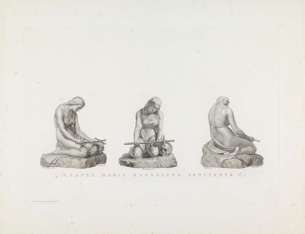This print, "Saint Mary Magdalene Penitent" by Antonio Canova, captures three studies of the sculpture in ink on paper. The composition is defined by the contrast between light and shadow, creating a serene and contemplative mood. Each of the three figures presents a different view of the sculpture. Note how the linearity of the figures and their placement invites the viewer's gaze to move across the page. The repetition of form encourages a comparative reading where subtle variations in pose and shading become significant. The use of line to define form and texture lends the work a tactile quality. Canova destabilizes the traditional view of penance through his Neoclassical idealism. He presents the figure with a refined, almost sensual approach, thereby questioning conventional interpretations of religious suffering. This subversion is part of a broader discourse about the body and representation in the late 18th and early 19th centuries. The structure of the artwork opens a discourse that intertwines beauty, faith, and the human condition.