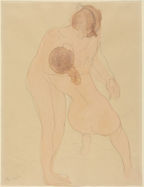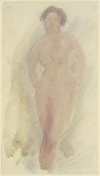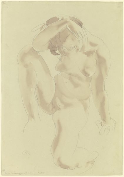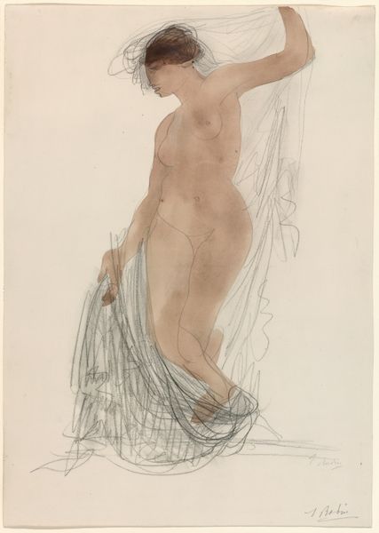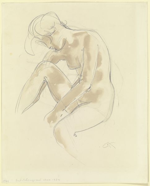 Curator: Before us we have Auguste Rodin’s “Sitzender Frauenakt,” a watercolor and pencil drawing on paper. Editor: It strikes me as surprisingly gentle, almost unfinished. The soft washes of color give it a fleeting, ethereal quality. Curator: The fluidity and translucence achieved through watercolor is particularly striking, contributing to the sensuality that’s commonly associated with his nudes. The deliberate restraint speaks volumes. Editor: Is it also significant that Rodin chose this medium as opposed to sculpting in bronze or carving marble as one might expect from him? Curator: Absolutely. Watercolor and pencil are direct, immediate. They capture a fleeting moment, allowing us to engage with Rodin’s working process—the intimacy between artist and model, the rapid capturing of form and movement. Editor: The pose itself is intriguing, wouldn’t you agree? The woman is reclining, yet there's an unease to it all. Curator: There's definitely an element of vulnerability on display here. The lack of specific detail in her face shifts our attention to her body. I suppose this rendering might perpetuate historical gazes toward the female form but at the same time it reveals his deep engagement with classical sculpture and his intent to explore the expressiveness of the human body beyond idealized notions of beauty. Editor: Indeed, the loose lines and washes feel almost improvisational. You almost sense Rodin discovering the form as he worked. But the unfinished aspect might not resonate with everyone; viewers might seek some resolution that it does not seem to give. Curator: An artwork can definitely create both intimate encounters and complex questions. Rodin captured his subjects in constant flux, embodying not just what they are but how they exist in a moment, or how they could possibly be perceived in a specific cultural time. Editor: Indeed, the impact an artwork has is determined as much by cultural norms and artistic value. Curator: And the artwork provides value by constantly shifting according to how it is perceived.