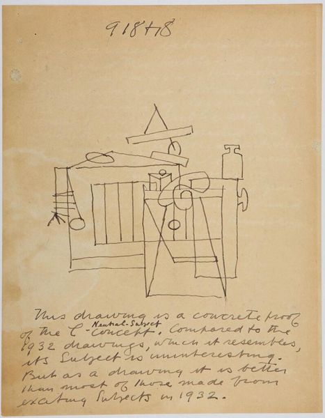 Editor: This is Stuart Davis’s “Art Theory Text with Sequence Sketches,” made in 1942. It’s fascinating – a page of sketches and notes. How do you interpret this work? Curator: The images are intriguing, aren't they? I see Davis grappling with visual language, how basic shapes can carry complex ideas. Notice the date – 1942. World War II was raging. Could these seemingly abstract forms be a symbolic language developed to reflect the disruption, the deconstruction, and reconstruction of the world? Editor: That's a new way to think about it! It adds a layer of historical and cultural depth that I hadn’t considered. Curator: Indeed. It makes one wonder, how do our personal experiences shape the symbols we create and interpret?