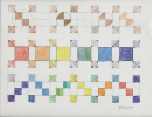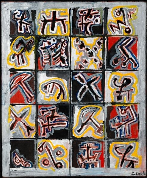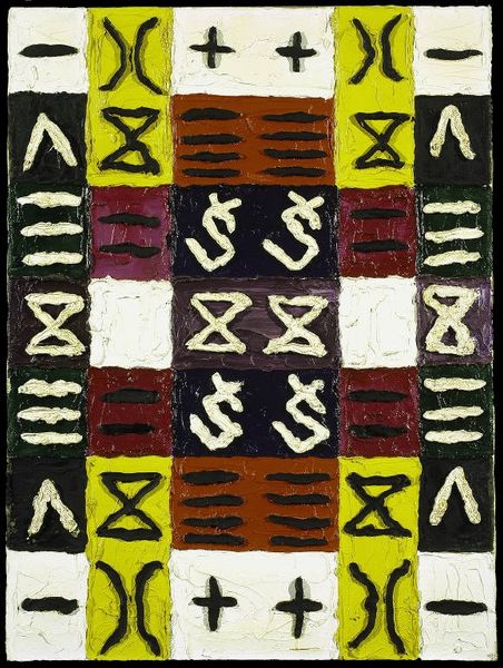Editor: This is "The Great Mystery II," created in 1960 by Alfred Jensen, employing mixed media. I’m really struck by the almost playful nature of the symbols, but also this sense of underlying order in the grid. How do you interpret this work? Curator: It's a fascinating piece! To me, the “mystery” isn’t just a conceptual one. Jensen was deeply invested in exploring systems of knowledge – mathematics, Mayan calendars, I Ching. It becomes clear when situating this work within his broader artistic practice of grappling with structures, that he sees such attempts at order as a way to deal with a colonial past. Does it challenge established hierarchies in your view? Editor: That's an interesting angle. It definitely disrupts the idea of a single, dominant perspective by combining diverse symbol sets. So is it pushing against established power structures and towards knowledge pluralism? Curator: Precisely! Think about it: He is appropriating systems of power while simultaneously divesting their significance through abstraction and aesthetic presentation, turning them into objects of art, not systems of knowledge or rigid hierarchies. The playful and intentionally naïve texture created through paint could itself be a decolonizing statement! Do you find there is something deeply rebellious about its naive presentation? Editor: Yes, I see what you mean. The textured surface and simplified symbols almost undermine the seriousness that one might expect from these systems of knowledge. I never would have thought about its decolonizing undertones without our discussion. Curator: It's about decentering Western modes of thinking. Through these non-hierarchical visualisations, Jensen implies we need to always challenge existing powers. I'm glad this conversation opened a new avenue into how we might interpret such work. Editor: Absolutely! I now see it's about more than just playful symbols. There’s a deeper, more critical dialogue happening here about knowledge and power.