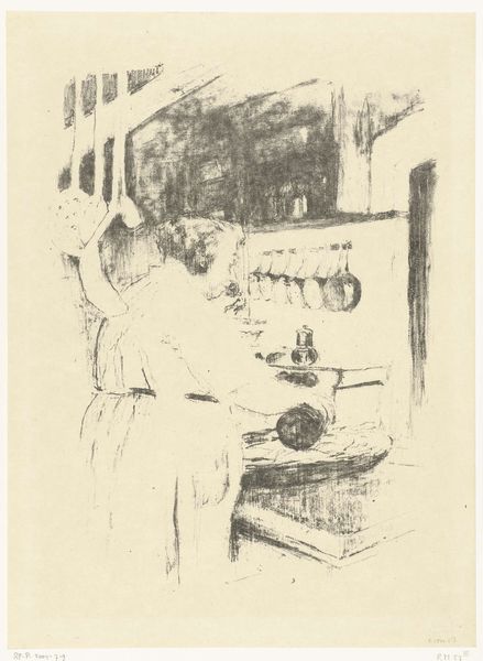 Édouard Vuillard rendered 'Cooking; The Cook' in 1894, using lithography on paper. The piece comes from a series depicting intimate interiors and everyday life scenes, which reflect the values of the artist’s avant-garde group "Les Nabis." Vuillard’s artistic circle challenged the rigid academic art of the time, opting instead to explore personal and decorative expression. “We wanted to get away from naturalism,” Vuillard said, signaling their shift away from traditional representation. Here, the sketch captures a cook in a domestic setting; a woman is seen from behind, diligently working in a humble kitchen. Striking in its intimate portrayal of domestic labor, the artwork invites us to reflect on the often unseen and uncelebrated work performed by women, particularly those in service roles. With this poignant portrayal, Vuillard elevates the quiet dignity of the cook’s daily tasks, prompting us to consider the value and social implications of domestic labor.