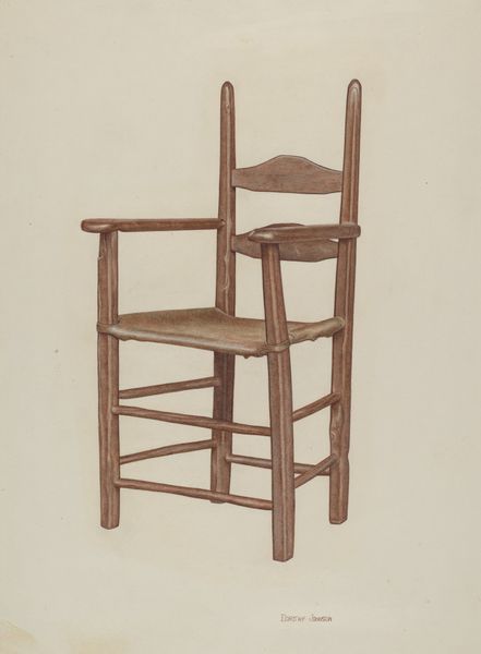 Rex Bush made this drawing of a "Chair (Jack Knife Type)" with, what looks like, pencil and watercolor. It's a pale drawing, a study in observation, not expression. I love the way that the off-white of the paper reads as the atmosphere around the chair, making it feel like it's floating in space. The woven seat is incredible, like a lesson in perspective. Look at the way that Rex Bush describes each vertical strut with light and shade, such subtle changes of tone. The whole composition is built up from tiny marks, gentle and deliberate. It reminds me of Agnes Martin's grids. They both take a simple form and make it sing through repetition and subtle variation. This piece is a reminder that drawing is about seeing, and that seeing is about taking the time to really look. It's a quiet, beautiful thing.