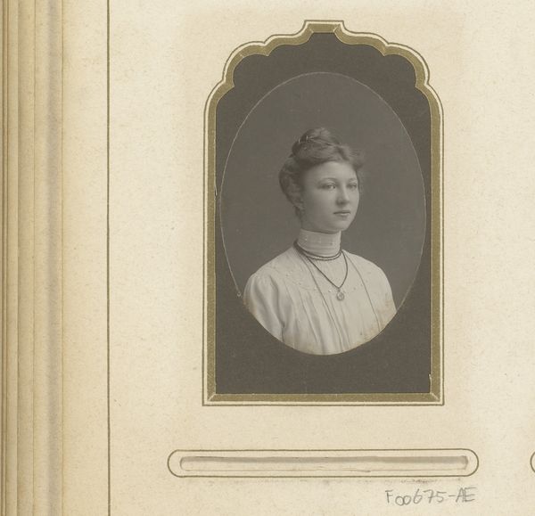 Curator: What a striking portrait. This albumen print, dating to before 1885, is entitled "Portret van Laura Linden." The photographer is Herbert Rose Barraud. It's held here at the Rijksmuseum. Editor: It has a fragile, sepia-toned beauty, doesn't it? Her gaze seems averted, as if she's caught in a private moment. There is almost a wistful mood that’s projected through the image's tonality. Curator: Yes, and consider the social context of portraiture in that era. Photography was increasingly accessible, yet portraits remained a potent symbol of status, particularly for actresses, who had fought so hard for that social mobility. Editor: Definitely. She's adorned with a frilly bonnet and a delicate shawl pinned with flowers. The flower emblem could speak to Victorian ideas about beauty, love, or even the fleeting nature of life, right? Curator: Precisely! These wouldn't be casual accessories. Notice how Barraud, operating a studio in Oxford Street, understood how an actress might construct and present an image of herself to her audiences. The inscription from a Nat Lee work is intriguing as well. "Were my whole life to come one heap of troubles... And sweeten all my griefs with its remembrance." Editor: It suggests perhaps that fame, or a moment captured in time, offered respite from life's difficulties, a notion reinforced through flowers in particular— emblems for life events! This could serve a symbolic form of armor against hardships. Curator: The formal composition reinforces this controlled image. We are drawn to the image's overall romanticism, despite her, as you pointed out, distant expression, but also, perhaps because it speaks to the societal conditions that influence such portraits. Barraud crafted an item that was clearly for a public audience, and for one that could have been bought to display a support and celebration of theater. Editor: An interesting blend of revelation and restraint, ultimately. It has this beautiful duality. Curator: Exactly. And an important commentary on the way images were created for—and how they circulated through—the late Victorian world.
