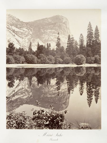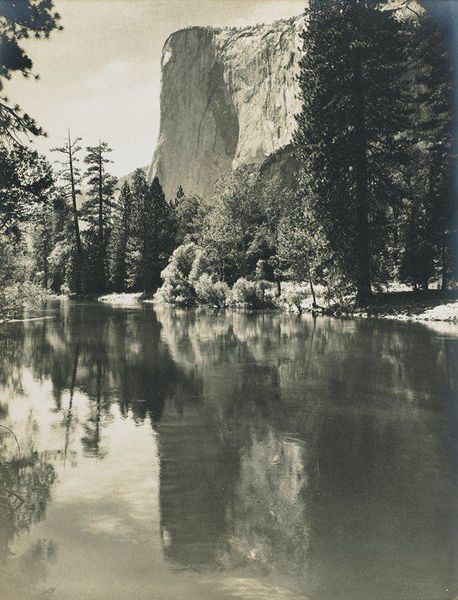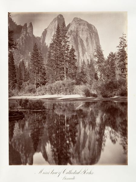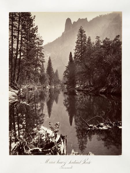 Curator: My first impression is hushed reverence. It feels ancient, like stepping back to when the world was brand new. Editor: We're looking at "Sentinel Rock, Yosemite," a gelatin-silver print created by Carleton Watkins between 1870 and 1874. The work now resides here at the Metropolitan Museum of Art. Curator: That title really nails it, doesn’t it? This mountain looms, an unwavering guardian keeping watch over this silent, silvered kingdom. The framing by those branches adds to the sense of discovering a hidden place. Editor: Watkins’ work significantly shaped perceptions of the American West. These photographs, particularly those of Yosemite, were instrumental in advocating for the park’s preservation. Imagine seeing these images in the late 19th century. They played a key role in constructing the mythology of the untouched American frontier. Curator: Mythology is key, I think. Look at the light, how it etches the contours of the rock. It’s romantic but almost…unearthly. Like something glimpsed in a dream, not a precise record, but a feeling evoked. I also see a balance of soft edges, and sharpness; it makes me ponder how ephemeral it is! Editor: The technical skill involved shouldn't be overlooked. Watkins employed the wet plate collodion process. Think about lugging all that equipment around, preparing the plates on site. This image not only captures a landscape, but reflects the massive effort and artistry required at that time. Beyond artistic impression, it's a feat of human engineering, really! Curator: I agree, understanding the sheer effort behind it does change how I see it! But the core remains this feeling, this stillness. Maybe it's that whisper of timelessness that Watkins, deliberately or not, has passed down to us. Editor: Indeed. It’s an image layered with artistry, advocacy, and a tangible link to a pivotal period in American environmental history. Watkins documented a changing landscape while simultaneously helping secure its future. A visual and political triumph.