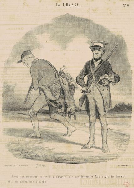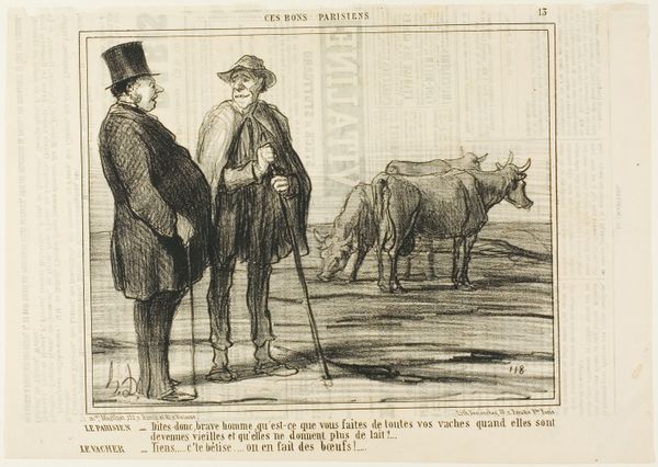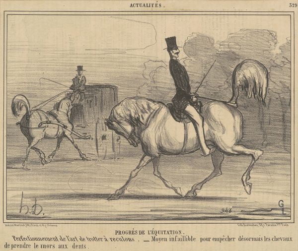 This lithograph is by Honoré Daumier, who was born in Marseille in 1808. Daumier lived through a period of immense social and political upheaval in France. In this print, Daumier satirizes the bourgeoisie. The central figure sits atop a horse-like creature, a symbol of his elevated social status, addressing two figures on the right. The horse-like animal seems to be less of a noble steed and more of a tired nag. The two figures in the foreground, in turn, seem weary of this person’s self-importance. Daumier critiqued the political climate and social customs of 19th century France by lampooning the wealthy and powerful. What does it mean to see your social betters rendered as, well, less than? Daumier seems to ask us to consider the true value of those who claim superiority, and whether their status is truly deserved.