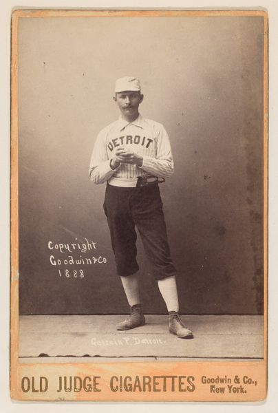 Curator: The image before us is a baseball card featuring a pitcher from Detroit. It’s part of a series called "Old Judge Cigarettes," produced by Goodwin & Company around 1888. These cards were originally distributed as promotional items. Editor: It’s incredibly direct. He’s positioned mid-throw, but there's no drama or action conveyed beyond that; just the bare essentials. It feels almost...clinical? Curator: In the late 19th century, photography like this served multiple purposes. On one hand, it captures the growing popularity of baseball. On the other, it served to boost cigarette sales, aligning leisure and recreation with consumption, and thus normalizing smoking within popular culture. Editor: Focusing solely on the photograph's compositional elements, the background is stark. This tonal flatness throws the player's form into relief, highlighting both uniform detail and his throwing motion, capturing a dynamic moment in the player's preparation. Curator: Think of the implications—the mass dissemination of these cards through tobacco products. These weren't viewed in hallowed halls but were traded among fans, pasted into scrapbooks, connecting sport figures to everyday routines and consumption habits. This piece highlights the rise of commercialized sport and marketing practices. Editor: Looking closely, one also notices subtle manipulations within the printing process; an accentuation, perhaps, on key details, a means to draw a viewer’s eye towards details like team name. In the modern sense, it may be the pre-cursor to advertising conventions used to highlight critical features, logos, or branding components, etc. Curator: Absolutely. And while it's easy to romanticize baseball cards, remember the broader social context. These cards weren’t just innocent collectibles; they reflect marketing's role in the construction of fame and the linking of sport to consumer culture. Editor: Indeed. Considering this image's straightforward framing, one might argue it is almost a deconstruction of the heroic portrait in baseball – the humanization of the game, almost like an athletic taxonomic study, devoid of grandiosity and only featuring the sport and athlete, down to the most specific visual details. Curator: Reflecting on its influence, it humanizes figures of burgeoning popularity while embedding brands deeply into people's recreational lives, which is a lasting technique that still reverberates throughout popular culture today. Editor: And seeing these techniques at play, more than a century on, offers great lessons in studying photographic compositions of popular figures and brands.