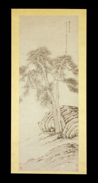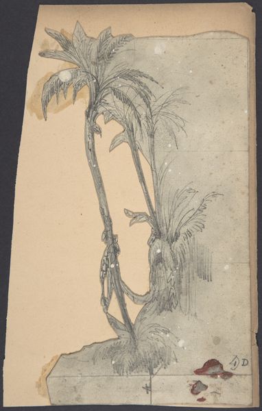 Curator: Eugène Cicéri's "Design for a Stage Set at the Opéra, Paris," dating from 1830 to 1890, presents us with a glimpse into the world of 19th-century theatrical design through the mediums of ink drawing and print. Editor: It has a strikingly wistful mood, don't you think? A grayscale symphony with the faintest blush of warmth on the background—almost sepia, with its strong vertical lines fighting with this very, very textured but limited plane. It also makes me think of loneliness. Curator: The strategic application of verticality is what first commands my attention. The arrow extending to the top border and those elegant palm fronds... They elongate the plane, lending a false and somewhat illusory dimension to this very still scene. Editor: To me, the plants evoke Eden, that paradise lost or a fevered dream. These botanical symbols can transport the audience beyond the urban environment. What feelings of colonial expansion do these symbols contain within them? Curator: A fascinating point. But note how the structure is built on balance, yet asymmetry reigns—how the foliage droops on one side while other portions push straight toward that aforementioned arrow. There's a constant push-pull at work between formal ideals and representational concerns. Editor: It is the eternal desire to reach an unrecoverable ideal, a nostalgic and mournful one. Perhaps a reminder that we, like these exotic species displaced onto the Parisian stage, exist outside of our "natural" setting? Curator: That tension gives the whole piece its vitality! See how those grid lines both define the pictorial space and conflict with the free, organic forms. It underscores a dialogue between control and expression that propels this piece. Editor: Perhaps this artwork’s lasting power lives less in the exact rendering but in its symbolic representation—longing. It encourages introspection of ourselves, these icons, and their position within society. Curator: An excellent way to think of this—Cicéri challenges the boundaries between precision and fluidity and opens up our perspective through the visual language of tension. Editor: I'll be haunted for days by how such simplicity may be able to hide all the depth held within that carefully drawn composition.