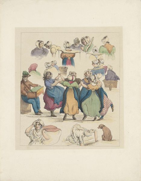 Editor: This hand-colored etching from 1787, titled "A Milliner's Shop", by Henry Kingsbury, is so bustling! It feels almost chaotic, yet there’s a strange sort of energy that pulls you in. What statements about 18th century class and gender dynamics might Kingsbury be making with this piece? Curator: It’s interesting you pick up on the sense of chaos. It's not just a snapshot of a shop; it’s a commentary on consumer culture and the social roles of women at the time. Think about who has access to such finery. Are they actively engaging in a world of commerce, status, and superficiality? Editor: So, it's not simply about hats. I initially just thought it captured a fashionable moment. Curator: Precisely. Look closer at the caricature-like rendering. Notice how the figures are exaggerated, almost grotesque? This was a period defined by stark societal contrasts, and the aristocracy were easy targets. Consider, too, the print medium, its association with accessibility, and the ability to distribute this satirical message widely. It provokes us to analyze these societal excesses. Editor: I see what you mean about it being a criticism. The exaggerated silhouettes and expressions feel very deliberate now. Do you think it also addresses gendered roles specifically? Curator: Absolutely. Women are centered within this space, as both consumers and objects of display. Are they empowered by their consumption, or are they trapped within its confines? Kingsbury compels us to interrogate these assumptions about female identity and agency. Editor: I hadn't considered how the artist's choices create a specific narrative, showing consumption and class consciousness of the era. I definitely see a new angle. Curator: Right, it becomes more than just a pretty picture. It holds up a mirror—perhaps that very mirror in the print—reflecting and questioning social norms.