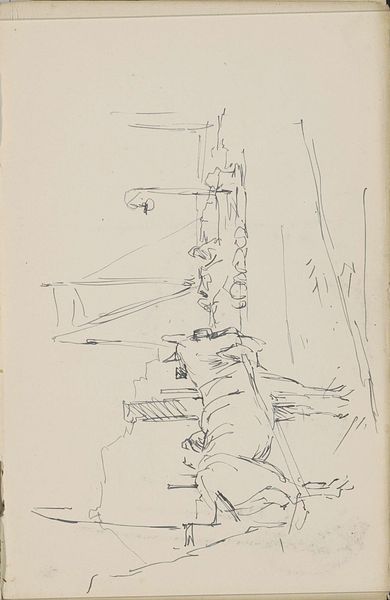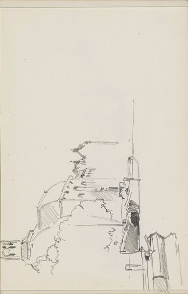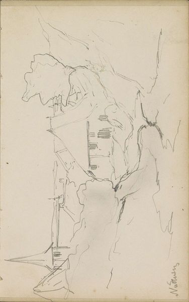 Editor: Here we have Cornelis Vreedenburgh's "Huizen aan het water," dating sometime between 1890 and 1946. It's a pencil drawing at the Rijksmuseum, a rather fleeting landscape. It feels so sparse and almost… tentative. What do you see in this piece? Curator: I see the bones of a place, a memory sketched. Vreedenburgh captures not just the houses but also the *feeling* of being near the water. Consider the verticality – the lines almost drip downwards. This isn’t simply about representation; it’s about conveying the psychological weight of place. Notice how some lines are firm, definitive – the architecture. And then other lines become frantic, scribbled – what does that visual contrast tell us about what is most important? Editor: That contrast is interesting! It’s like the architecture is solid and enduring, but the nature around it is… ephemeral? Curator: Precisely. The solid geometry suggests permanence, the familiar. Water and foliage are organic, alive. Vreedenburgh invites us to consider: what aspects of our surroundings truly remain with us? What fleeting impressions fade? Editor: So it’s not just a landscape; it’s a study of memory and emotion tied to a place? Curator: Exactly! It's an invitation to consider our own internal landscapes. What symbols do *we* carry with us, linking place, time, and emotion? Does this connect with you personally? Editor: I think it does. It's a reminder that our experience of a place is shaped by more than just what we see, but how we *feel* about it, what it means to us. Curator: Indeed. And the symbols he chose continue to resonate today, showing us a little about who we are. Editor: I never would have thought to look at a simple sketch in such a way!
