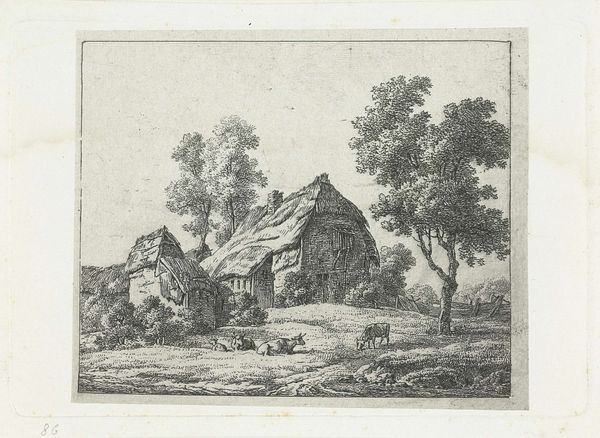 Curator: So, here we have "Boerderij en man met twee emmers," or "Farmhouse and man with two buckets," an etching by Boëtius Adamsz. Bolswert, created in 1614. It’s currently held in the Rijksmuseum. Editor: My first impression? There’s a sort of resigned poetry to it, wouldn't you say? The stark simplicity of the house almost mirrors the curve of the weary-looking man struggling along. Curator: Yes, precisely. Bolswert was a master of imbuing commonplace scenes with layered meaning. Genre paintings of this era, like this one, often functioned as more than just picturesque depictions of daily life. The farmhouse itself, with its thatched roof and visible wear, might be a symbol of earthly impermanence. Editor: Ooh, the impermanence of shelter! Love that. The man's burden of the buckets, too— it's as if carrying water is as fundamental to the human condition as the home where you drink it. Curator: And note the artist's choice of etching, a printing technique that allows for fine, detailed lines. The clouds above and the vegetation have this chaotic quality, hinting maybe at external pressures bearing down. He wasn’t just replicating life; he was imbuing it with allegory. Consider how vital water and the provision thereof were. This man bearing it must carry significance. Editor: It's a loaded image in its way. You know, the more I look at this humble man doing his work, the more monumental it becomes. It isn’t necessarily a ‘heroic’ pose, yet I sense the weight of centuries of laborers, each enacting their lives as though their world depended upon it... because, indeed, it did. Curator: Precisely. It is a visual emblem that is open to a range of symbolic interpretation: survival, hard labour, connection to the land and sky above. Editor: Right, a perfect snapshot—excuse the modern term for a very un-modern image!—of life’s fundamental acts, heavy in meaning despite the ordinary scenery. It certainly got me pondering the things we take for granted. Curator: Indeed. It offers an arresting, poetic distillation of a bygone era, made vivid with symbolism, presented to our own time.
