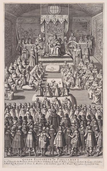 Curator: This engraving by Frans Hogenberg, dating from 1570, depicts the "Proclamation of the General Pardon." It's currently held at the Rijksmuseum. Editor: My immediate impression is one of meticulous detail and dense composition. The steep perspective and regimented figures almost create a sense of oppressive order, despite the implied act of forgiveness. It also really clearly establishes a sense of status and social position in the figures displayed. Curator: Precisely. The image captures a significant political moment—an attempt by the Spanish authorities to pacify the rebellious Dutch population. Consider the symbolic weight of that central architectural setting, likely representing civic power, and the careful positioning of the figures representing various social classes. Hogenberg, like many artists of his time, used printmaking as a means of disseminating political narratives. Editor: It's fascinating to consider how the act of pardon is itself framed as a top-down process. Look at how the engraver used the very material of the print, the incised lines, to delineate power dynamics, from the ruling class figures right down the steps to the citizenry. What are the material limitations and challenges of using this linear style? What type of labor went into this level of replication for it to serve as propaganda? Curator: Absolutely. This form of dissemination was revolutionary, and Hogenberg clearly understood how the relatively reproducible medium of engraving could shape public perception, a powerful tool. But in that same vein, how are these people who the image intends to represent able to access and interpret these visual constructions? Editor: Good point. I am still very interested in what kind of paper this was printed on; paper in this period was so variable in texture and production. Curator: Right. These prints weren't just aesthetic objects, but potent tools in shaping socio-political consciousness and establishing narratives of power and authority. They show us not only a past event, but also how that event was curated and disseminated to a specific audience. Editor: Seeing this work today reminds us of the labor and choices involved in making history tangible. We appreciate not only the subject represented, but also the tangible and conceptual material making its accessibility possible.