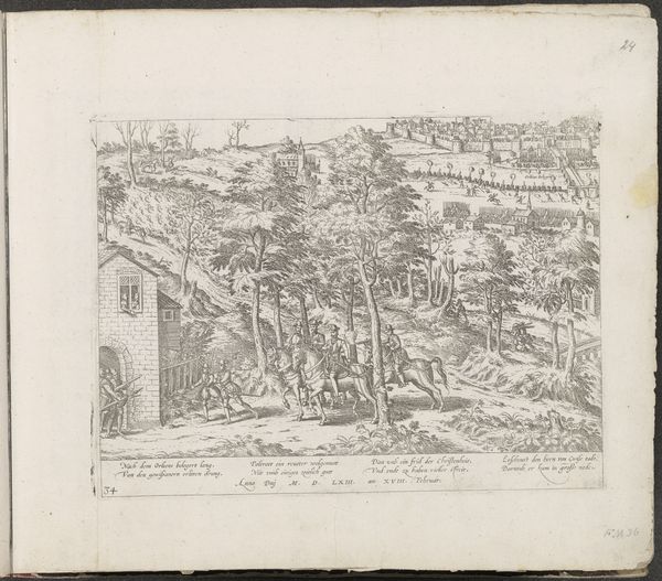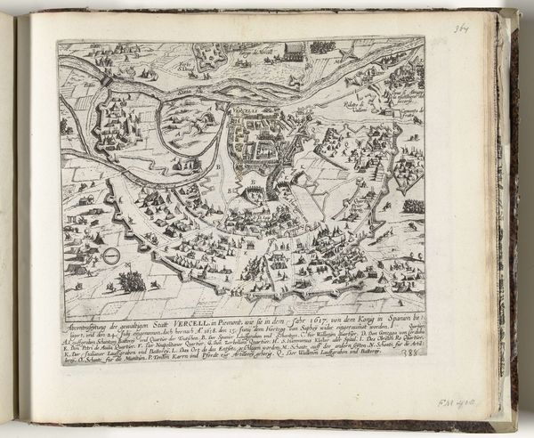 Curator: This print, titled "Slag bij Dessau, 1626," depicts the Battle of Dessau during the Thirty Years' War. It was created between 1626 and 1628, by Frans Hogenberg, an engraver known for his historical and topographical prints. It’s currently held at the Rijksmuseum. Editor: My first impression is how meticulously detailed it is. Even in miniature, there’s a distinct energy conveyed by the lines and patterns of the figures. The linear perspective, while rudimentary, attempts to create a sense of depth across a rather busy composition. Curator: The print offers a bird's-eye view, showcasing troop movements, fortifications, and the surrounding landscape. Hogenberg's work gives a window into how historical events were visualized and disseminated to the public at the time. Prints like these served as a form of news and propaganda, influencing public opinion and shaping collective memory of significant battles. Editor: What’s striking is the organization, a sort of controlled chaos. See how the artist utilizes clusters of similar marks to depict crowds, but individual detail gets lost for the sake of creating textures. I find it conceptually intriguing as to how something this intricately patterned manages to visually communicate an understanding of such violent events. Curator: Indeed. Consider the context: Europe was in turmoil. Visual representations of victories, or even strategic standoffs, played a role in bolstering morale and projecting power. Prints were relatively accessible, which is essential to their societal function in image politics. Editor: Absolutely. And formally, I’m drawn to the use of contrast— the play of light and dark created by the engraving process—it lends the whole scene a dramatic quality that I can recognize in Baroque landscape paintings. Curator: Studying prints like "Slag bij Dessau" helps us understand the intersection of art, politics, and society in the 17th century, revealing how imagery shaped historical narratives. Editor: From my point of view, the aesthetic choices made by Hogenberg contribute significantly to our engagement. We're left with the power of perspective, miniature, and intricate detailing to convey a vast sense of conflict.