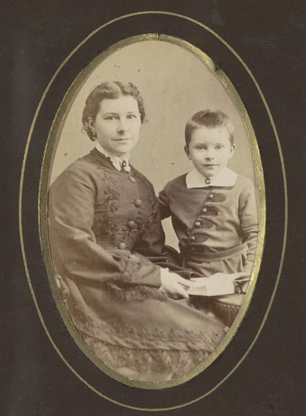 Editor: So, here we have a gelatin-silver print titled "Studioportret van een vrouw met kind op schoot" by Franz Wilhelm Deutmann, dating from about 1863 to 1866. The photograph shows a mother holding her child, both looking rather serious. I’m struck by the materiality of the image; the tones are muted and create this poignant intimacy, capturing a moment seemingly for posterity. How do you see this work, from your perspective? Curator: This photograph, with its materiality of gelatin-silver, interests me primarily for what it reveals about photographic production in the mid-19th century. We must consider the studio setting – a deliberate construct meant to project a particular image of domesticity. The clothes of the woman and child, while appearing simple to our eye, were probably meticulously chosen and are very valuable historical fabrics. Editor: So, it’s less about the personal connection and more about the context in which it was produced? Curator: Exactly! Think about the labour involved – the photographer, the subject carefully arranging herself, the probable hours spent retouching. And the intended consumer. Photographs like these were often for a wider familial consumption, not just for personal viewing. What does this mass reproduction mean for notions of family values being spread? Editor: That's a point I hadn't considered. It changes my reading entirely, knowing how much care and manipulation would have gone into creating this seemingly simple image. Curator: Right. What we see as a ‘portrait’ can be viewed, materially and economically, as evidence of emerging production, commodification, and control over the medium. How the print has degraded adds another layer - how has its physical manifestation changed through display, decay and interaction? Editor: It makes me think about the photograph less as an image and more as a product of its time. Thank you, this was illuminating. Curator: Likewise, considering it through a material lens highlights photography’s complex relationship to both art and industry.