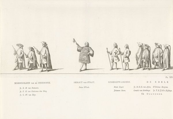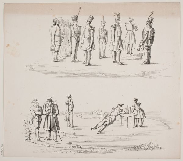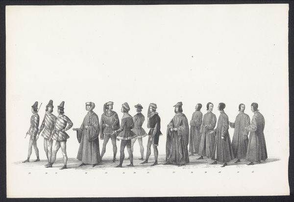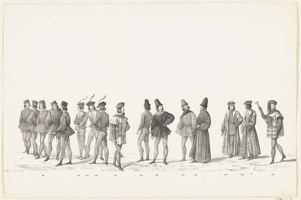 Curator: Here we have a pen and ink drawing from 1865 by Jan Daniël Cornelis Carel Willem baron de Constant Rebecque titled "Maskerade van de Leidse studenten, 1865 (plaat 13)", depicting a procession of figures. What's your immediate impression? Editor: It feels very austere, almost regimented. There’s a starkness in the lines and the repetition of figures; the texture, even just rendered in ink, suggests something quite rough. Curator: The artist was deeply involved in historical societies and these drawings often depicted important historical moments and student traditions, contributing to a sense of national identity and academic ritual in the 19th century. Editor: Interesting! Knowing that context gives me a different perspective. Looking at the materials and technique, the quick strokes of the pen, repeated forms, really speak to production – almost mass production – of images to propagate a particular historical vision. It also speaks of labour intensive process. Curator: Precisely. The romantic style allowed the artist to engage the audience by depicting history in a rather idealised manner, which contributed to creating heroic national myths that were displayed and shared widely. Editor: I’m struck by how the focus is less on the individual student than on the collective, or the role they’re performing. The rough application makes me think of affordability too. What sort of printing process would they have used? And for what specific audience? Curator: The artwork probably was not meant to function as a detailed individual portrait but more like a piece commemorating Leiden student culture, consumed among university attendees or alumni eager to own these mementos. It is interesting to consider how images like these help to reinforce social cohesion, belonging, or hierarchies, whether conscious or not. Editor: I suppose, by framing specific cultural memories and practices as 'historical,' these drawings performed important ideological work, creating and then affirming student traditions. Considering their method of production alongside their subject provides additional context. I’m curious to learn about how Leiden student culture might have informed their circulation, too. Curator: This piece underscores how art shapes collective memories, but also reflects certain historical ideals promoted in mid-19th century academic circles, which influenced art trends and culture, but also academic institutions. Editor: Absolutely. Seeing the intersection between process and content here makes you consider these drawings in relation to production and identity creation. Curator: Yes, thinking about their history can provide even greater context and insight.