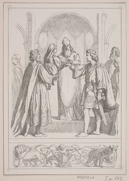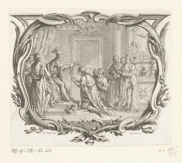 This is Laurent Cars's "Vignet met een ridder die een eed aflegt op de bijbel vastgehouden door Henry de Bourbon," made some time between 1699 and 1771. The print shows a formal scene, encased in a decorative frame, dominated by figures in period attire, with the central focus on a knight kneeling to take an oath upon a bible. Cars uses line and composition to direct our gaze, structuring a hierarchy of attention, with the oath-taking knight at the base and Henry de Bourbon holding the Bible at the visual apex. Note how the artist uses the semiotic language of gestures. The kneeling knight performs a ritual of submission and loyalty to Henry de Bourbon which is emphasized by the bible he holds, a symbol of divine authority. The architectural backdrop is a stage-like setting, which enhances the performative dimension. The frame, while ornamental, serves as a boundary, marking the transition between the world of the viewer and the allegorical space depicted. The artwork functions as a site of cultural inscription, reflecting and reinforcing ideas about power, duty, and the relationship between the secular and the divine. It reminds us that art is not a neutral mirror but an active agent in shaping historical narratives.