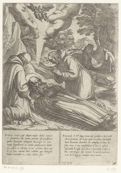 This engraving by Antonio Tempesta, likely from the late 16th or early 17th century, depicts "H. Antonius bezocht door demonen", and immediately the composition draws us into a world of the tormented saint. The stark contrast of light and shadow, achieved through Tempesta’s meticulous use of line, structures the scene. Note how the dense, dark foliage on the left sharply contrasts with the airy, light-filled landscape on the right, dividing the composition into distinct zones of psychological tension. This division echoes the saint's internal struggle with temptation. The figures themselves, rendered with exaggerated expressions, serve as signs of inner turmoil and the destabilization of spiritual resolve. Tempesta employs a semiotic system of visual cues. The landscape is more than a backdrop; it functions as a symbolic space where the saint's spiritual battle unfolds, prompting us to consider how the artwork challenges fixed notions of piety and virtue.