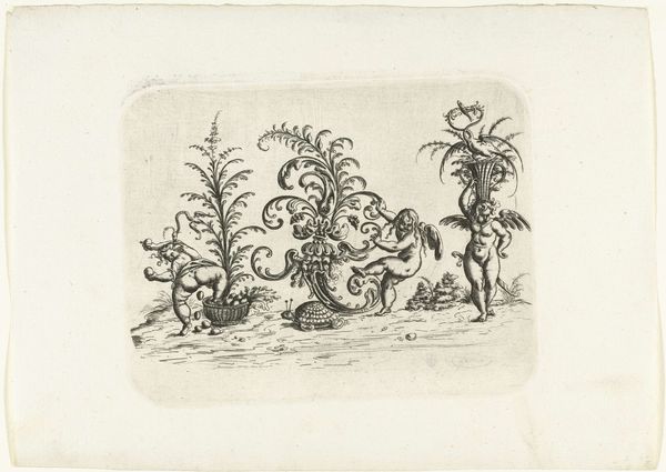 Christoph Jamnitzer created this artwork, *Man met een vaandel op een geitenbok,* or *Man with a flag on a billy goat,* using etching techniques. Amidst the backdrop of the late 16th and early 17th centuries, Jamnitzer crafted this complex work reflecting the societal values of the time. The central figure astride a billy goat, holding a flag, evokes the era’s fascination with heraldry and symbolism, but it goes beyond mere representation. The surrounding fantastical creatures embody the period's intersection of scientific curiosity and mythological beliefs, blurring the lines between the real and the imagined. This etching also reflects the societal position of artists such as Jamnitzer. Artists navigated the complex network of patronage, crafting works that served both artistic expression and the social and political agendas of their patrons. The meticulous detail and symbolic richness speak to the artist's skill and the cultural value placed on craftsmanship. Reflecting on it, the work is more than an image; it's a historical dialogue, a study of the intersections between status, belief, and artistic expression.