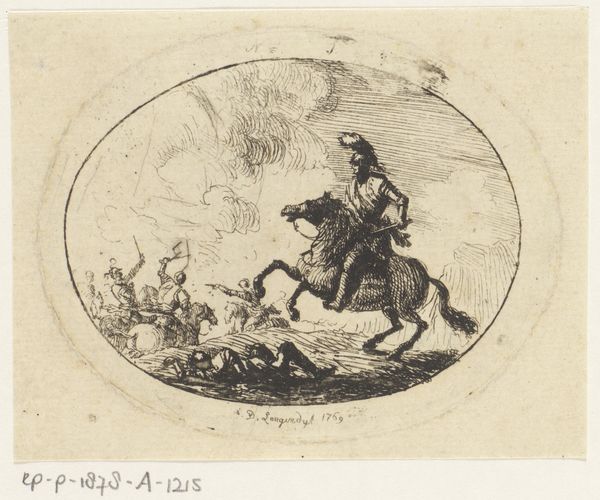 Anthonie van den Bos created this small medallion depicting a horseman, using etching techniques. The composition immediately draws the eye to the center, where the horse and rider are placed prominently within the circular frame. Note how the artist uses line and form to convey depth and movement. The figures on the left and the tree to the right create a landscape which recedes into the distance. The lines are not just descriptive, but structural. Semiotically, the medallion shape itself is a sign, a symbol of containment and focus. This containment invites us to closely examine what’s inside, decoding the relationship between the figures and their environment. Consider how van den Bos uses the etching medium. The fineness of the lines, the subtle tonal gradations – these aren't merely aesthetic choices. They are fundamental to how the artwork communicates. We are left contemplating the interplay between form and content, recognizing that art is not a fixed entity, but a dynamic field of interpretation.